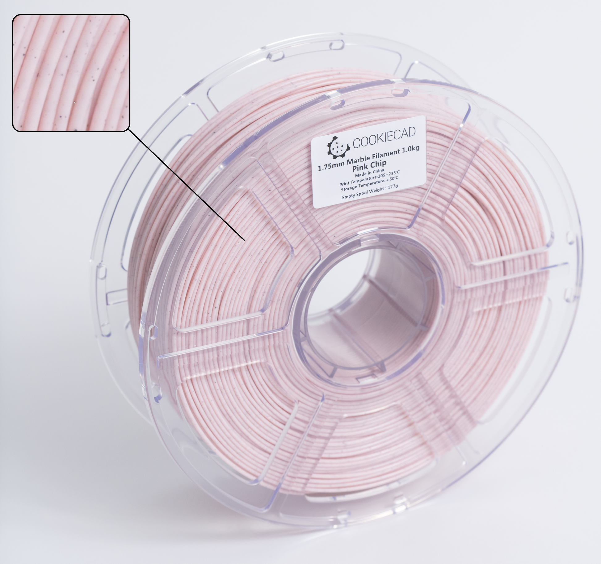 This is Pink Chip - a light pink with marble specs. The marble specs add an interesting texture to your prints and visually hides layer lines. Also check out Vanilla Chip and Mint Chip.